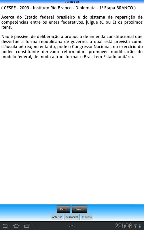 4) Ao final de cada simulado, o aplicativo mostra uma estatística de quantas questões você acertou e errou. Assim, você pode acompanhar seu progresso nos estudos facilmente.