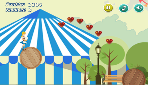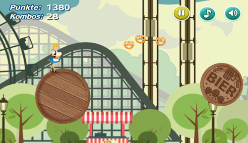 The Oktoberfest is known as the world's largest funfair. It is held annually in Bavaria's capital Munich, Germany. Large quantities of beer are consumed at the Oktoberfest which brings us to the waitresses who do a great job there bringing the beer to the visitors all day long. The waitresses wear dirndl, a traditional women's dress of Bavaria. In Dirndl Dash, players jump from beer barrel to beer barrel collecting a wide variety of traditional Bavarian food such as Hendl (roast chicken), Weisswurst (a white sausage), along with Brezen (pretzel) and gingerbread hearts. Get as many treats as you can and beat your friend's highscore!