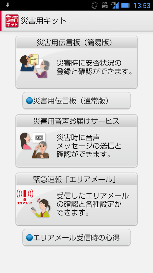 “Disaster Kit” is an app for docomo smartphones which enables you to use Disaster Voice Messaging Service, Disaster Message Board Service,and Early Warning “Area Mail” provided by NTT DOCOMO.