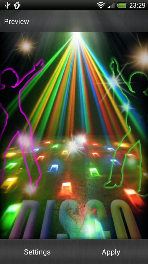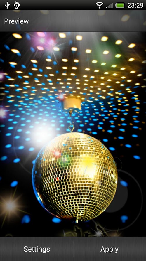 Disco music might seem outdated now, but gorgeous colors of disco light and classic disco ball will never become obsolete. Fabulous rainbow on the dance floor makes you dance with the old classic records. And while you're dancing and enjoying yourself, a magnificent disco ball shines over your head like a star. The fun is unsurbassable! There's nothing else like it. Today you cannot easily find a club that plays disco music, a modern DJ prefers livelier beats and rhythm, but in every single club you will find a disco ball. Dark club and colorful lighting make the ideal atmoshere for night fun. The only thing missing in this picture is a disco ball. Disco balls sparkle, glitter and shine wonderfully, without that shine the atmosphere is simply not complete.Dark room and colorful light create romantic and at the same time exciting atmosphere. Are you ready to boogie? DJ turn up the music! Go to the nearest club with friends, but first make sure that club is a real disco, meaning that it has a true disco ball and lighting. But what is the origin of this shiny ball? Has it existed before the disco era? While disco is frequently the butt of jokes, no one can deny the mesmerizing effect of a spinning disco ball. Covered in hundreds of tiny mirrors, the disco ball spins light around the room and can instantly transform a dull event into a party. Although most people associate disco balls with platform shoes, Studio 54 and other staples of the disco craze, the disco ball actually predates disco by more than 50 years.A staple of many 1920s nightclubs, the mirror ball (as it was called then) never fully took off until the right blend of music, lights and colors combined to create a craze in the 1970s. Disco's repetitious grooves and the disco ball's hypnotic glow worked in tandem to ensure the mirror ball's place as an undying symbol of the disco era.After disco, the disco ball became commercialized. Today, the mirror ball is visible in many aspects of everyday life. From disco ball earrings to hipster lounges that spin the ball for the appropriate atmosphere, the disco ball permeates American life far outside the realm of disco. Unlike polyester suits, the mirror ball has survived the death of disco and is now as beloved as the strobe light. Proms, concerts and late-night makeout sessions all benefit from the multi-mirrored surface of the disco ball. “Night life” would never be the same without the recognizible light from the beloved mirror ball. Don't miss this opportunity to get this fabulous shiny symbol of the disco era. Download Disco Light Live Wallpaper now and dance till you fall under red, blue, green and pink light. DJ play the music louder!