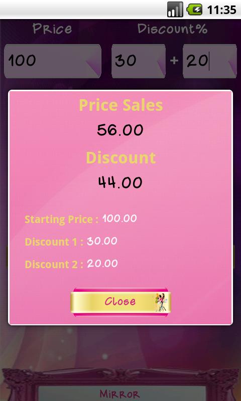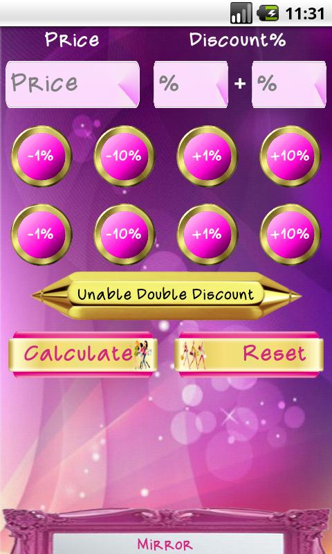 "Discount Calculator & Mirror - Women Edition" is born to solve women necessity to calculate the discount of a price in a faster and easier way. Discount Calculator is: