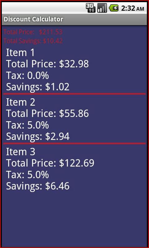 Discount calculator that makes calculating a sale easy. Just enter the original amount, the %off, add sales tax(if you want) and click "Calculate Savings". If you are shopping and want to save your items for future reference or to keep up with how much you are spending just click "Save Item" to save the current deal to a database for future reference. Click "View Saved Items" to view all of the items you have saved. The "Delete Saved Items" button will clear the database when you are finished shopping.