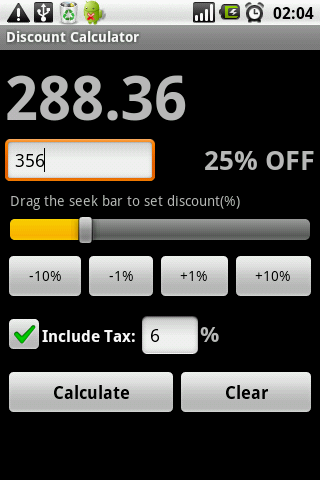 Drag the seekbar or press the ‘+1%’ ‘-1%’ ‘+10%’ ‘-10%’ button to set the discount value quickly,check the ‘Include Tax:’ to calculate a product contain tax after discount.