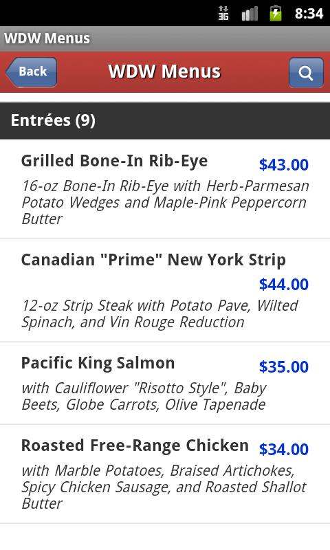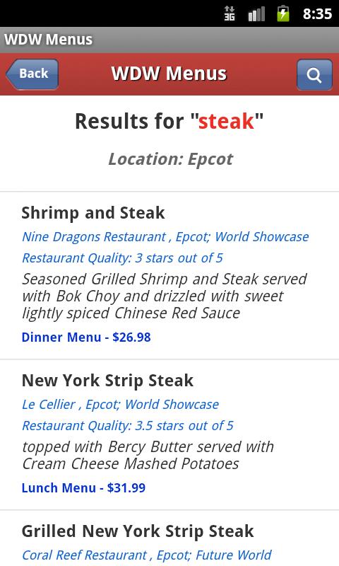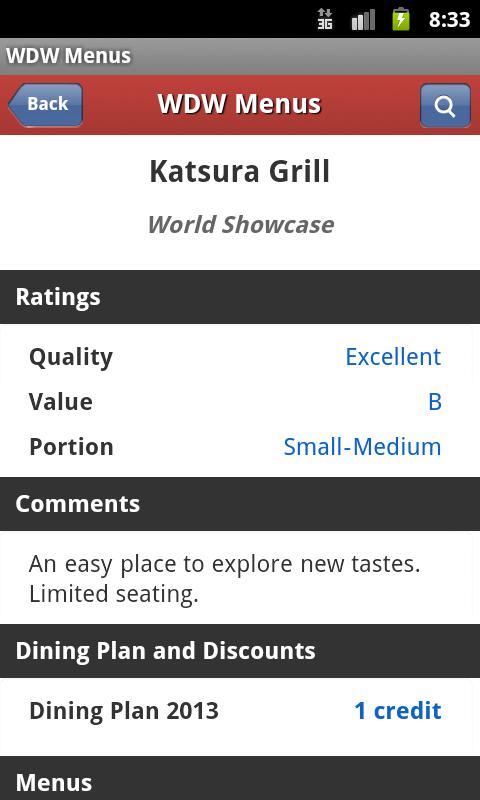 MENUS gives you up to date menus, prices and quality ratings for every restaurant, kiosk, food cart and stand in Walt Disney World. We created Menus so families can easily decide where and what to eat on vacation. The Menus app shows you which foods count as snacks on the Disney Dining Plan, and menus and prices for special events such as Epcot’s Food & Wine Festival. A handy search feature shows where to find exactly the food you’re looking for.