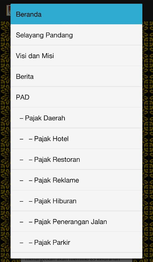 Ke-11 pajak tersebut dikelola Dispenda Pekanbaru berdasarkan amanat Undang-undang nomor 28 tahun 2009 tentang Pajak Daerah dan Retribusi Daerah.Official Application Department of Revenue (Revenue) Pekanbaru. This application contains the latest news about the development of the city, the economic and financial development of the city, especially on Local Taxes and Levies.