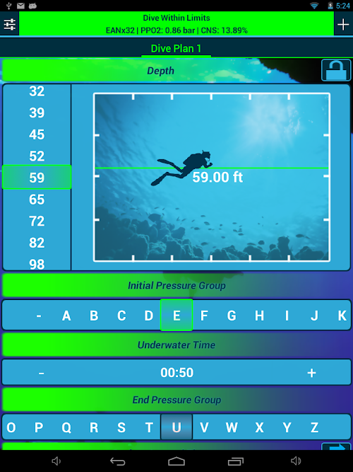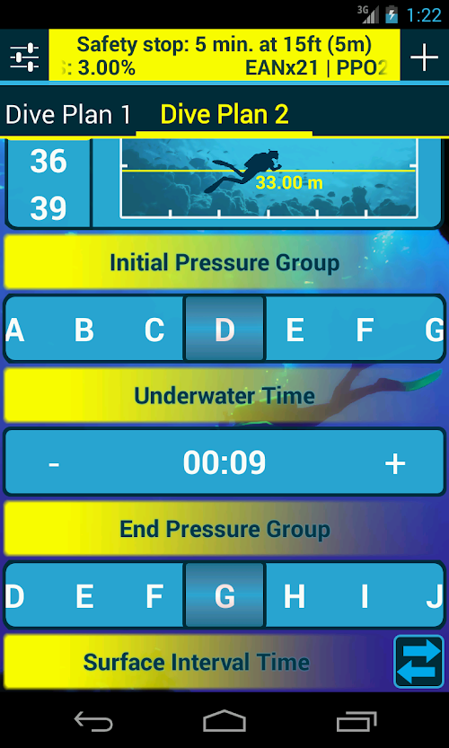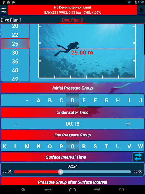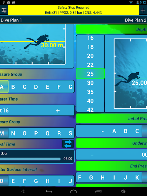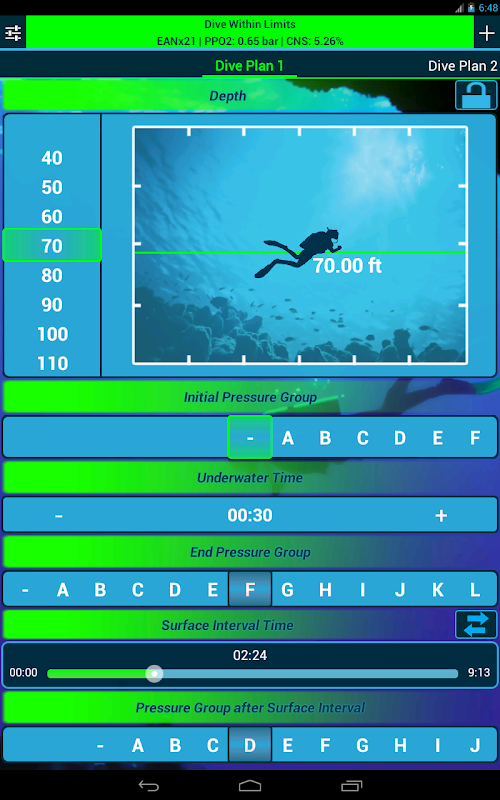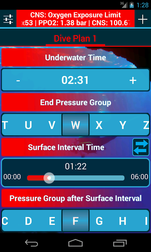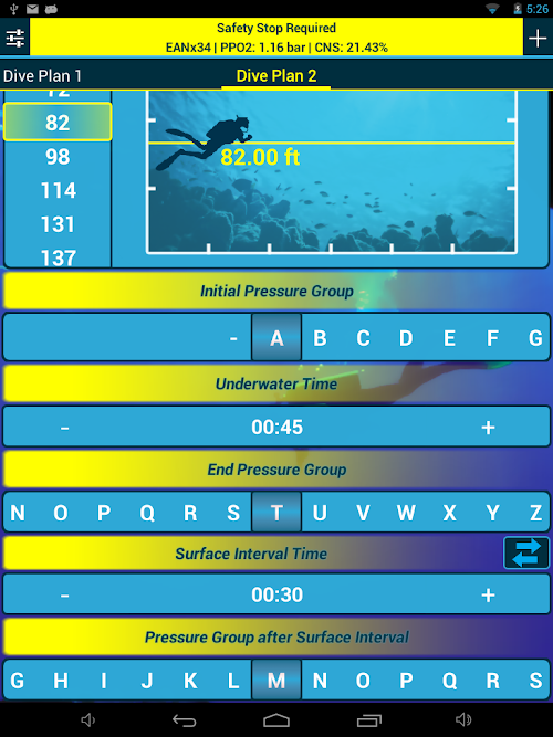 * Calculates end pressure group, pressure group after interval time, oxygen partial pressure (ppO2) and CNS (single exposure).