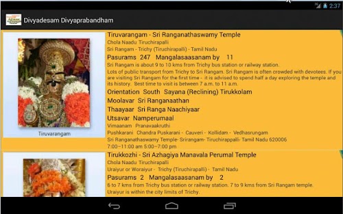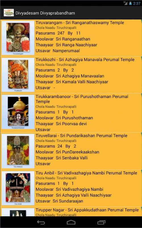 This app gives you live experience of Divyadesams with divyadesam details along with utsavar's photo.