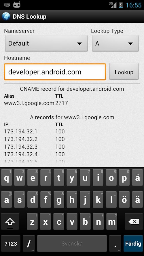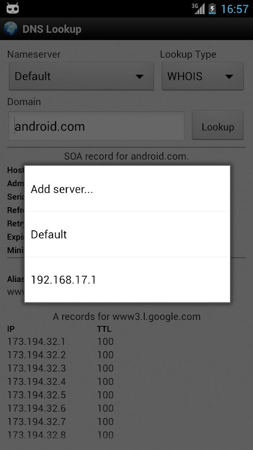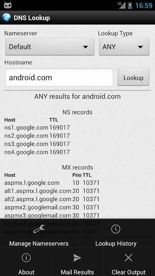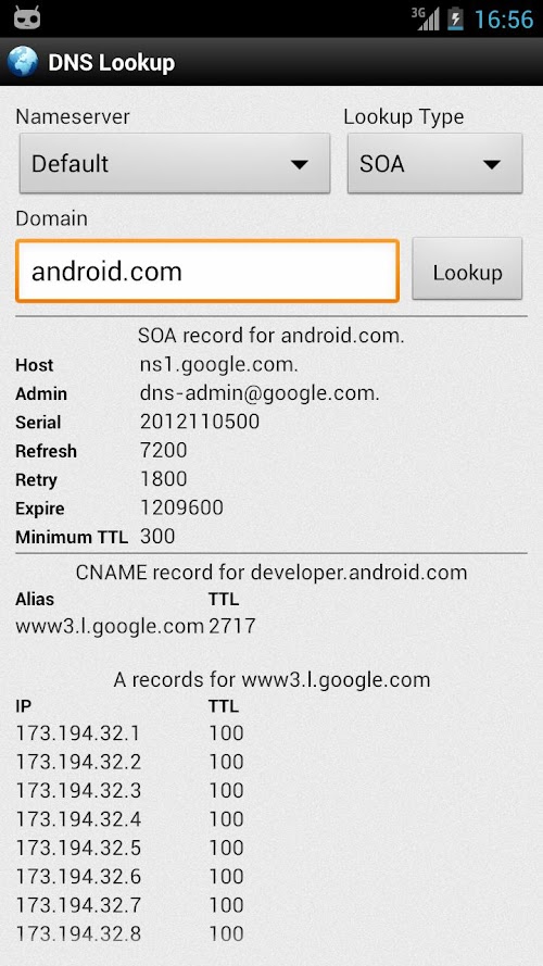 The leading DNS and WHOIS lookup tool for Android. Supports the use of multiple nameservers and DNS record types. The currently supported types are A, AAAA, AXFR, CNAME, NS, MX, PTR, SOA, SRV and TXT. Supports copy-to-clipboard, send output by mail and lookup history.