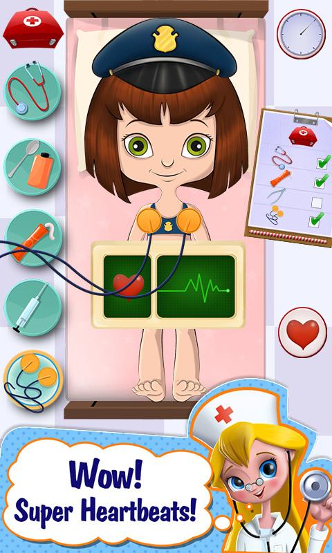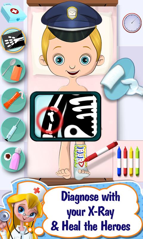 You can’t heal the heroes at the hospital if you don’t know what’s wrong with them! Listen carefully to what they say to get clues about their ailments and use the nurse’s advice! Use the stethoscope to listen to their heartbeat! Try the thermometer if you think they feel sick, pretty soon you’ll know if they have a fever, doc! You have all the tools to make the right diagnosis and a helpful nurse, it’s up to you to save the heroes at the hospital!