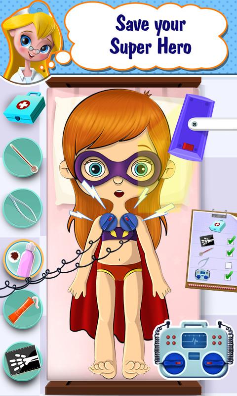 You’ll have to use all of your doctor skills to help heal these heroes, doc! Once you have your diagnosis, it’s time to treat the heroes with medicine! Use a vaccine, try some cough syrup, or fix their broken bone; use the medicine right, and the heroes can go back to saving the city! As the urban heroes’ doctor, you can give your patients a boost with cool medicine like electroshock and the x-ray machine, or cut their clothes with the scissors to get to the problem!
