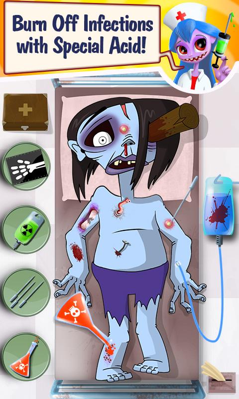 Our scientists are working on a cure, so in the meantime, we need you to stitch them up, find and remove the nails, worms and all the bits and pieces of things! So, Dr. X, I’m sure you have all your awesome tools from before and some new ones too in those bags of yours! Now let’s get to work and treat some zombies! (They might try to bite though, doc, so be careful!)