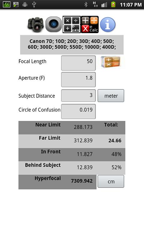 DOF Calculator Plus to find the near, far and hyperfocal distance for a specific lens, enter the focal length (mm), aperture (f/number) and the object distance.