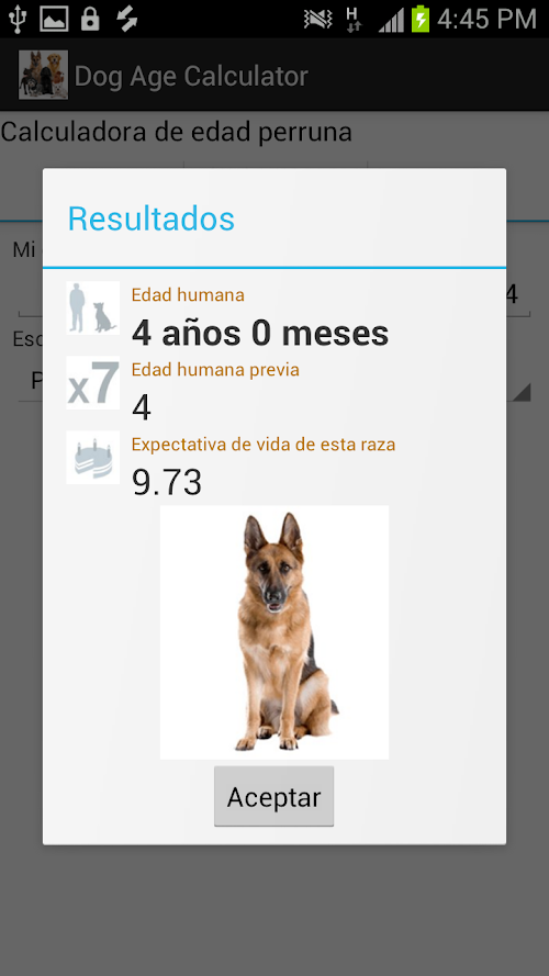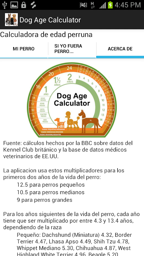La aplicación usa estos multiplicadores para los primeros dos años de la vida del perro:
