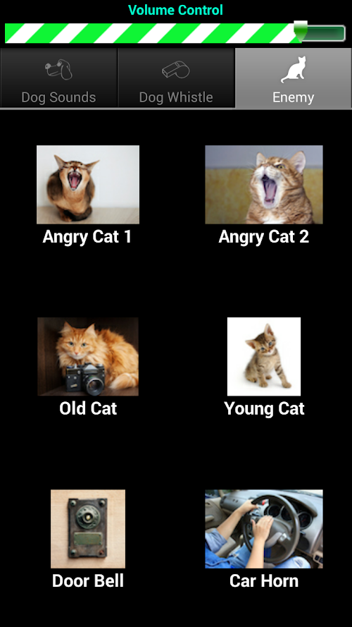 Sounds include a bug big bull dog barking, Scared Dog, Angry cat, Cat Rejection sounds and Dog whistle sounds.