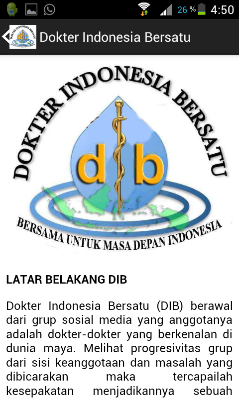 Aplikasi ini adalah salah satu usaha DIB untuk mensosialisasikan perjuangan kami dan memberikan pemahaman bahwa permasalahan kesehatan Indonesia sangatlah besar dan membutuhkan perhatian segera dari semua pihak. Sumber Informasi pada aplikasi ini merujuk kepada website resmi Dokter Indonesia Bersatu www.dib-online.org.  Pada Aplikasi ini kami juga menyediakan Forum Konsultasi masyarakat, sebagai betuk sumbangsih dan kepedulian DIB terhadap kondisi kesehatan masyarakat, dengan adanya forum konsultasi ini, diharapkan adanya Edukasi untuk memberikan pemahaman kepada masyarakat tentang penyakit dan Terapinya