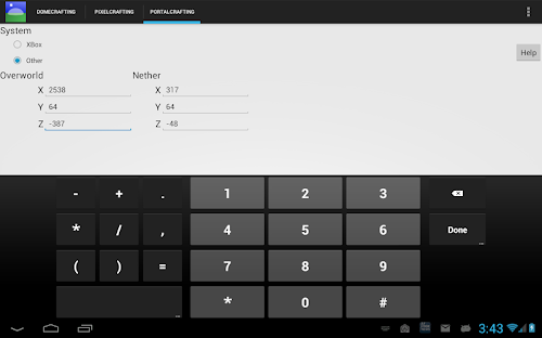 The PortalCrafting tool calculates the coordinates of the nominal portal location in one world for given portal coordinates in the other world. This is useful if you use Nether portals to speed travel between distant Overworld locations, or if you create complex maps with multiple portals.