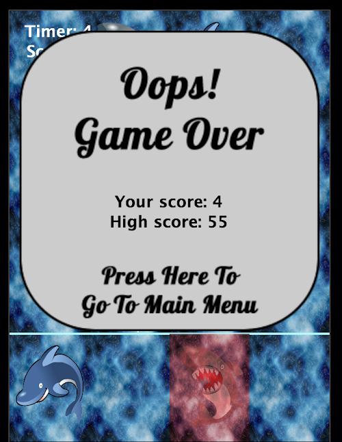 How good are your reflexes and coordination? The goal of the game is simple; touch as many dolphins in thirty seconds as you can without touching the water or touching a shark! If you touch the water, you'll hear a "splash" sound and you will lost 6 points, but the game will keep going. if you touch a shark, you'll hear a "chomp" sound and the game is over. For every 10 dolphins you touch, you'll gain 1 second on the timer. What's your high score going to be? ;)
