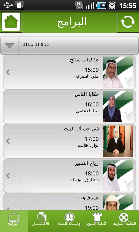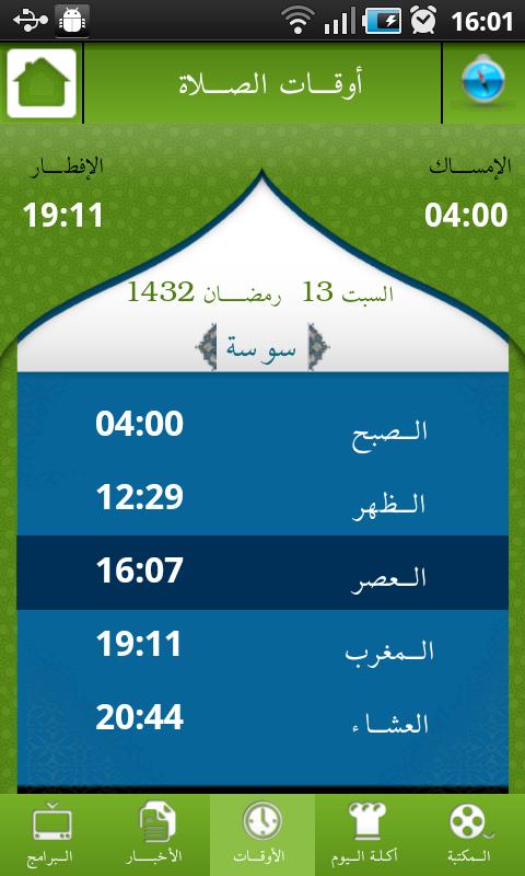 • تتبع مواعيد برامج القنوات التونسية (حنبعل ، نسمة...) والقنوات العربية الإسلامية (الرسالة، إقرأ...) و أشهر القنوات العربية (أبو ظبي, أم بي سي...).