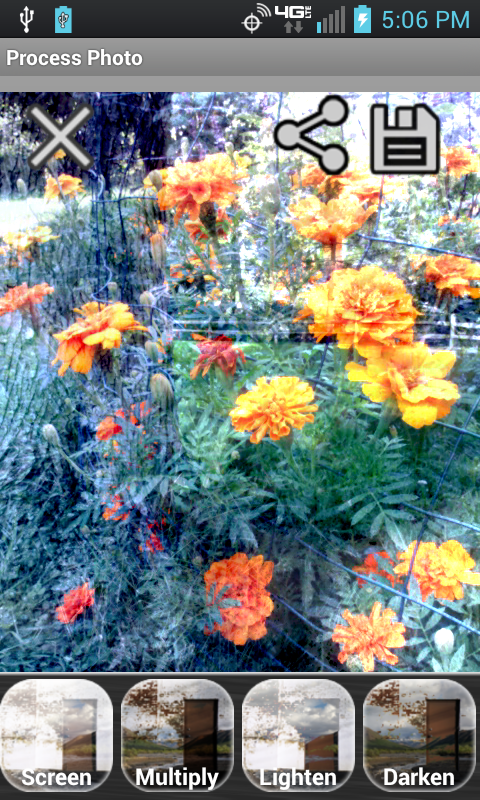 -Choose from four different blending modes to combine your photos – Screen, Multiply, Lighten, and Darken