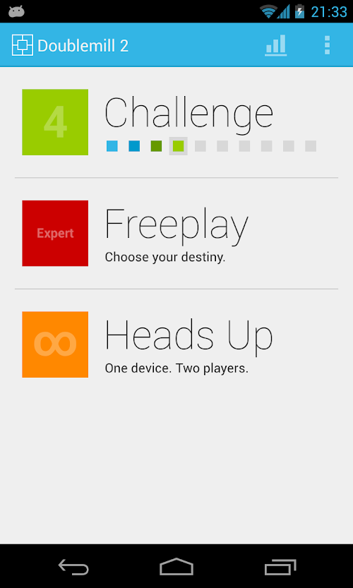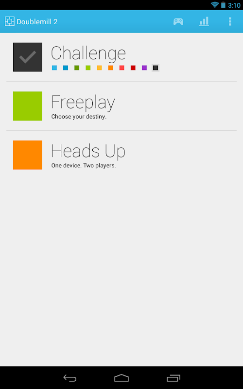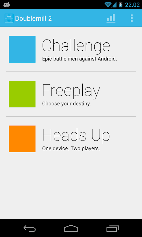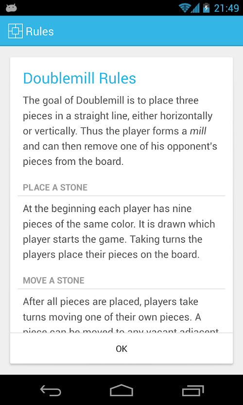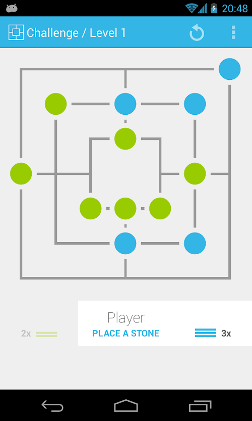 Doublemill 2 brings the world famous nine men's morris game into your hands. Enjoy a modern looking game with precise controls and fluent graphics. Doublemill 2 has multiple game modes like the "challenge" mode. Fight through many levels against an increasingly stronger Android. If you want to choose your enemies strength, try "freeplay". In "heads up" mode you can play with a friend on one device to find out who is best.