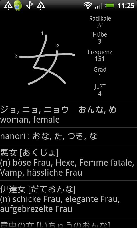 Examples of Words containing the Kanji, with meaning (English/German/French/Russian)