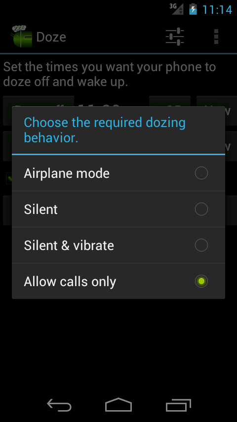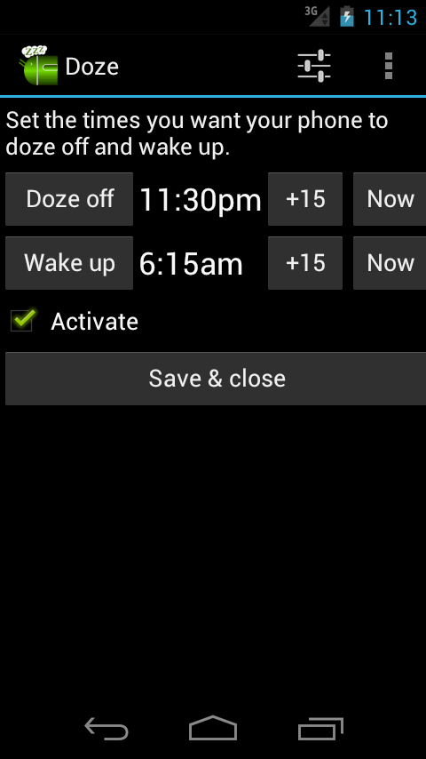 Doze is a lightweight Android app that allows you to specify a time for your phone to doze off and a time for it to wake up again. Dozing off can mean turning off the radio connections, or just silencing the calls and emails.