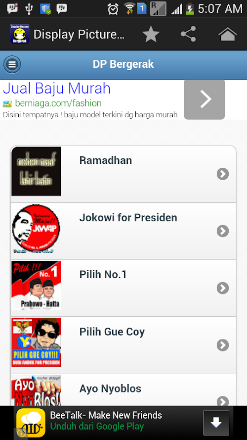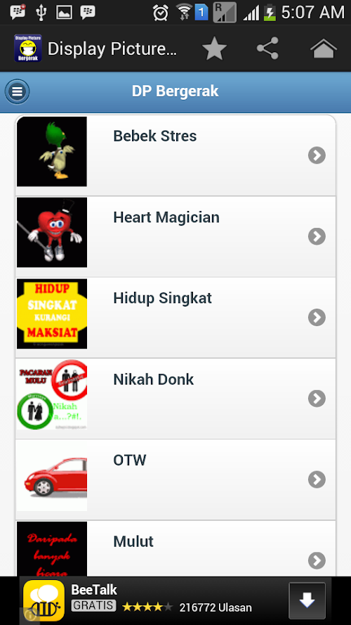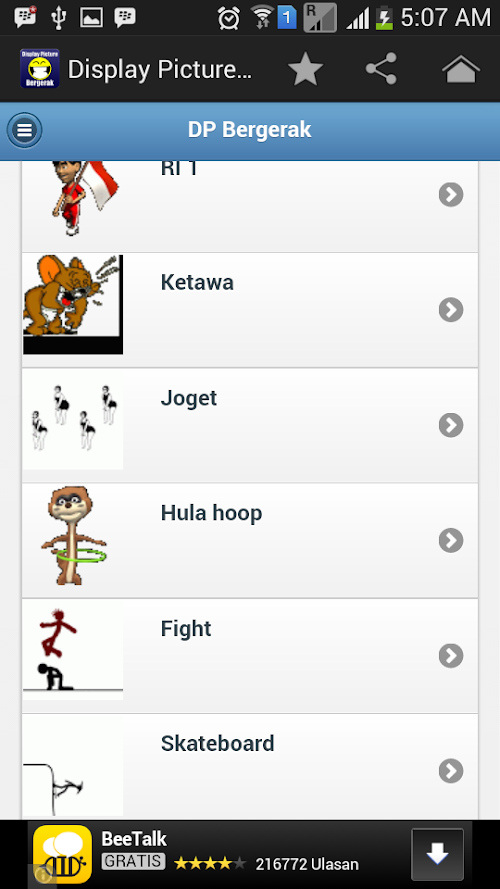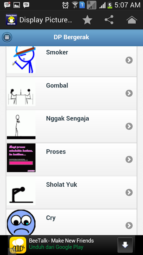 DP Bergerak for Android merupakan aplikasi dp bbm gambar bergerak atau DP Bergerak lucu-lucu yang bisa anda pasang di aplikasi messenger anda. Aplikasi ini update setiap harinya, dapatkan gambar-gambar lucu terbaru disini. Jangan lupa ngasih rate yang bagus yaa kalo kamu suka. Thanks.
