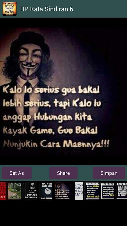 Dengan Aplikasi ini, kamu bisa membagikan banyak gambar dp ke temanmu. Tunggu apa lagi, download sekarang juga. Pasti kamu akan merasa senang.DP word sentence contains images satire Satire smooth or rough to a friend, girlfriend or others. With this application, you can easily get pictures themed satire. You can make the image to update the status of fuel, fb, etc. By using images satire, certainly people who feel quipped will see it and moved his heart. There are many collections, so you can freely express your feelings.
