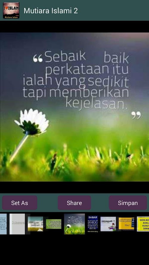 Dengan Aplikasi ini, kamu bisa membagikan banyak gambar dp ke temanmu. Tunggu apa lagi, download sekarang juga. Pasti kamu akan merasa senang.DP Mutiara Islami contains a collection of images Conditioning word heart about life. By using this application, you can get a variety of sentences were very nice with Islamic wise words full of meaning and can make our hearts become more calm and able to improve our behavior. Said Aphorisms Islam usually is a collection of quotes from famous figures of Islam on Islamic life. But it rarely made by an anonymous source with respect to their own problems, with the intention of sharing experiences with others. Just like other aphorisms, only in Kata Kata Mutiara Islam rules used are the rules of Islam so maybe it is intended only to the followers of Islam.