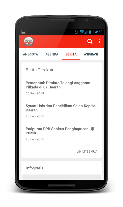 Through news features masayrakat can see news updates related to individual members of Parliament and also news related to the functions of Parliament as an institution such as the discussion of specific laws. In the feature also has features that will give infographics social and political education in user applications and display data with attractive appearance