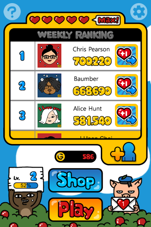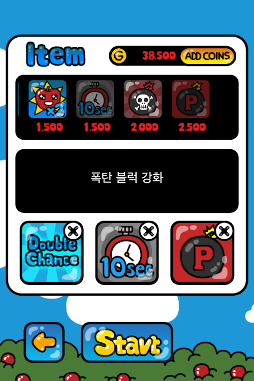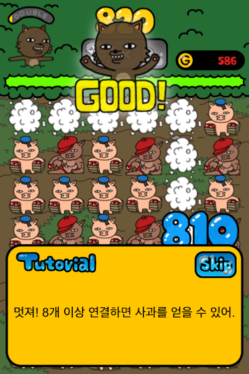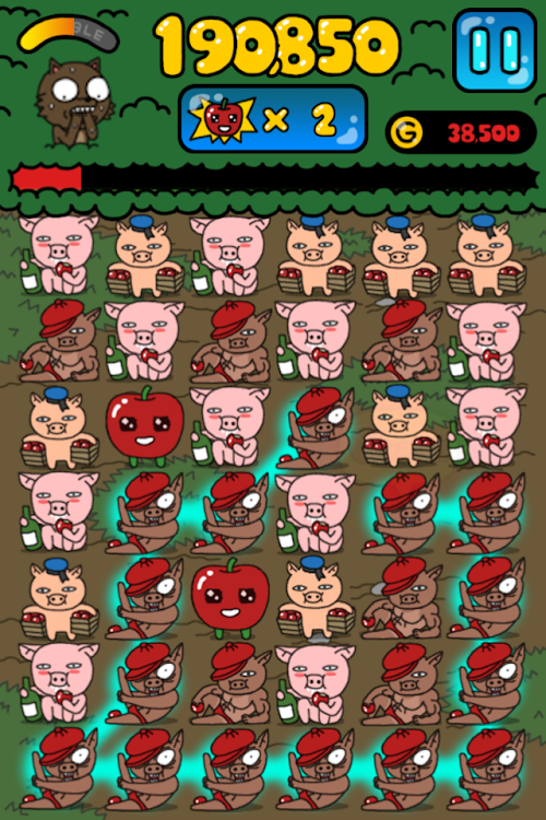 -Connect more than 8 same shapes of character blocks in once, an apple block will appear.