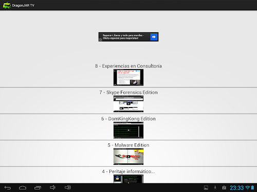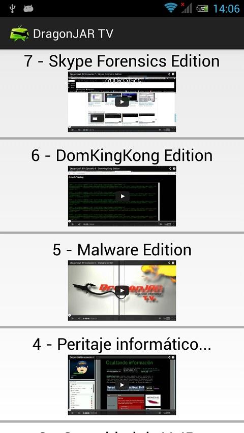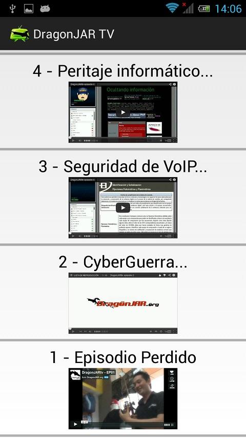 Se irá actualizando esta aplicación conforme se inserten nuevos vídeos en la web.DragonJAR TV is a simple application that allows direct and convenient way to access the chapters DragonJAR TV will provide to the community.