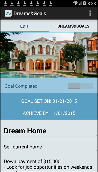 The Dreams&Goals app is an open tool for you to clearly state and visualize your dreams/goals in an easy-to-use timeline format. Every entry you input is added to your timeline and fully editable by you. Many say that the key to success is to keep your vision in front of you at all times, and now you can see your dreams/goals every time you turn on your phone.
