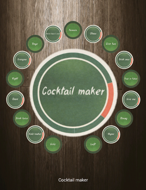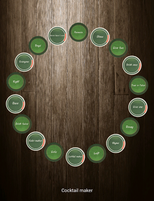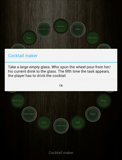 The players are starting with spinning the Alcohol Wheel. The wheel has 18 drinking task. After the spin the wheel will randomly stops at a task and then you have to do what the task says. A detailed description of the task can be seen after pushing the task's text under the wheel.