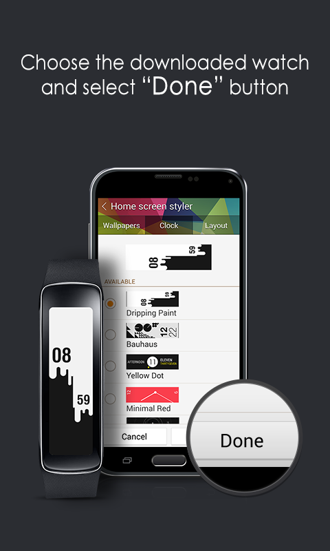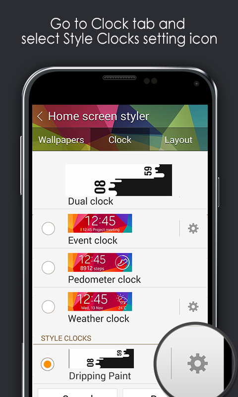 - You can find the downloaded clock app at Gear Fit Manager application (Home Screen Styler → Clock tab → Style Clocks setting menu).