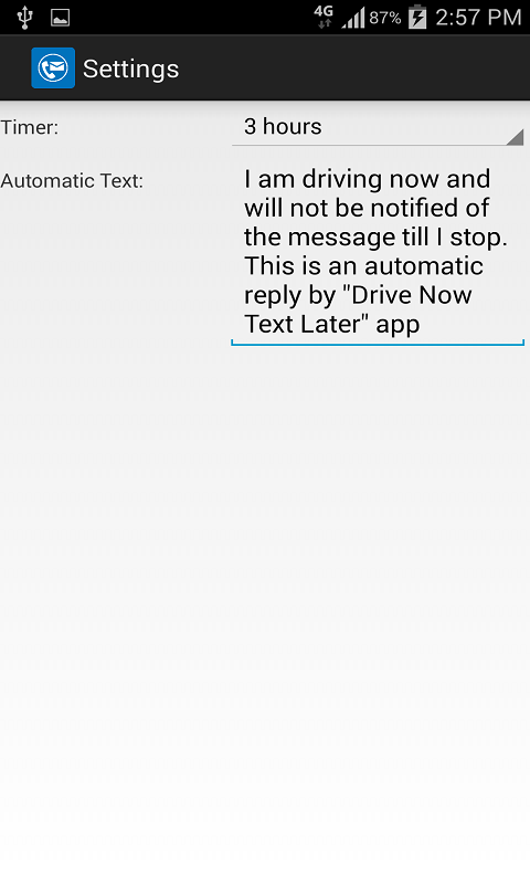 ● The App will automatically reply to Incoming texts/calls by a default message notifying senders you are driving (Auto reply text is user customizable).