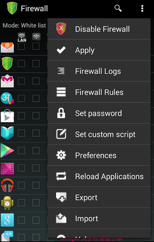 DroFireWall is a front-end application for the powerful iptables Linux firewall.