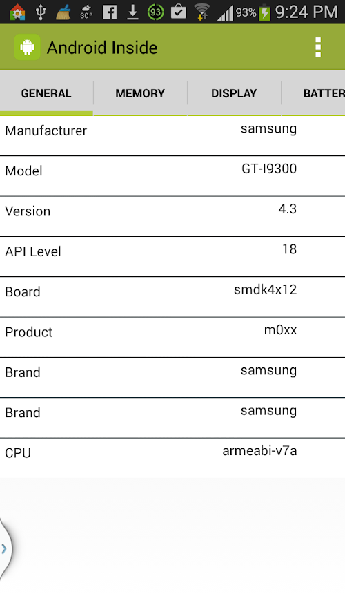 - General: Device Manufacturer, Model, Android System Version, Main board model, CPU Instruction Set