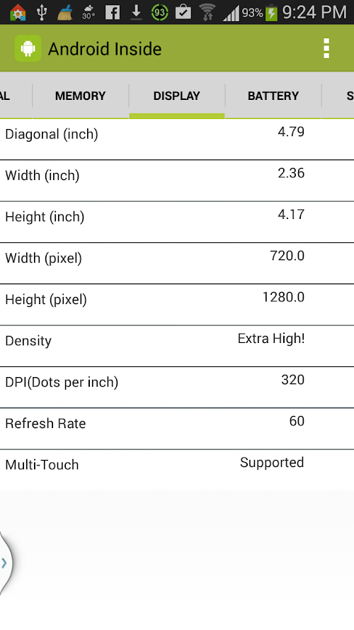 - Display: Display size in Inches & Pixel, Density, DPI , Refresh rate.