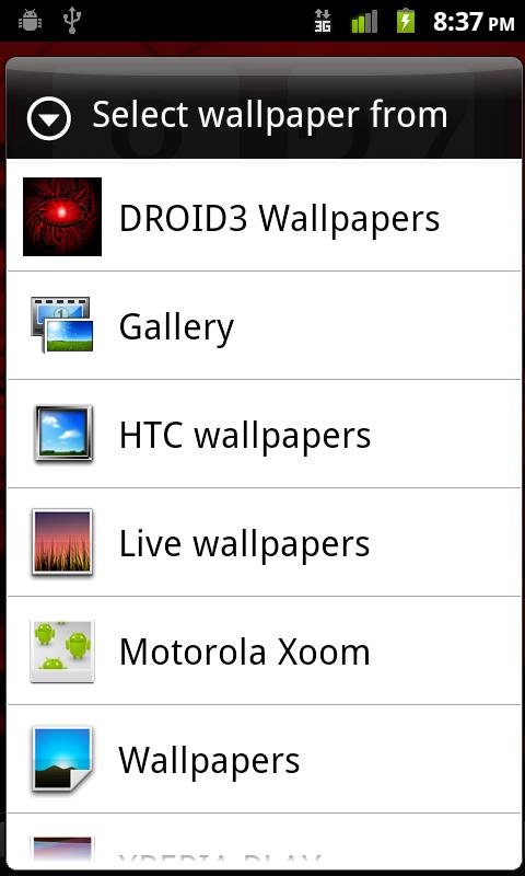 To use: long press on your homescreen, select "Wallpapers", select "DROID3 Wallpapers", select the wallpaper of your preference and enjoy!