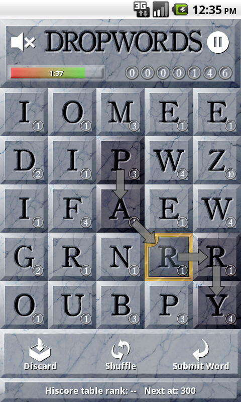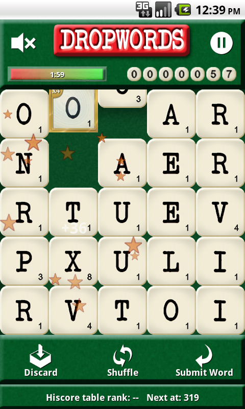 Dropwords is word-finding puzzle that combines some elements of Scrabble and Boggle. Valid words boost your score and the dwindling timer; used letters disappear and new ones drop from above.