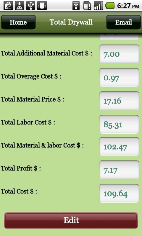 Drywall Pro Estimator is the most complete carpentry tool in the Android. The App is so complete it will do the bidding for you. Plus, you can email all of these totals to yourself or the client!