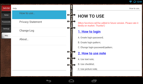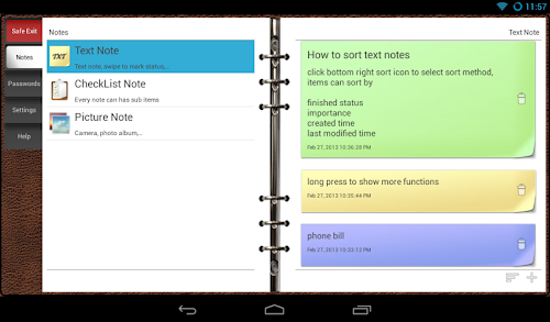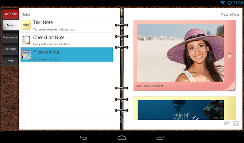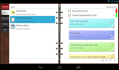 User can save privacy note with this app, do not afraid of be watched by "CLOUD", swpie to mark it as finished or not, set diff importance level, sort note with diff ways, also can share to others...
