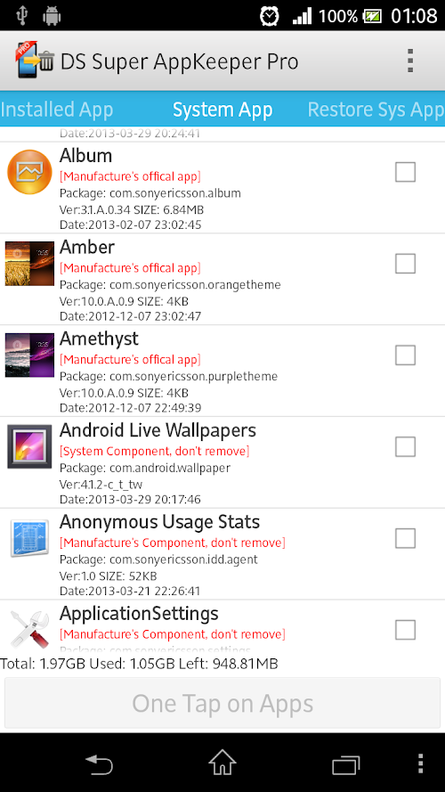 5. Remove system version of system update app: Update version of system app takes more space than normal app, since the system version is still exist on device after updated. This function can remove the system version and reinstall updated version with single operation and get more memory space.