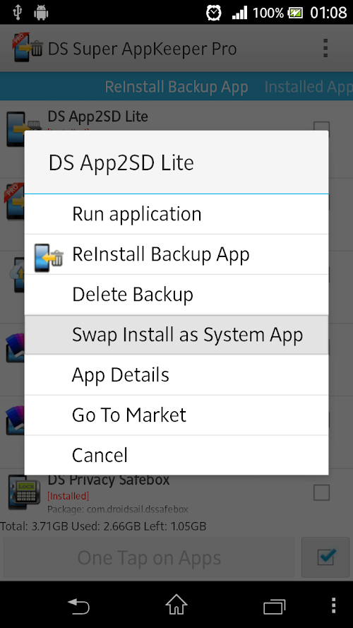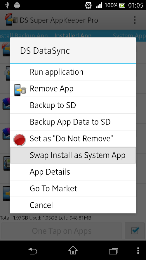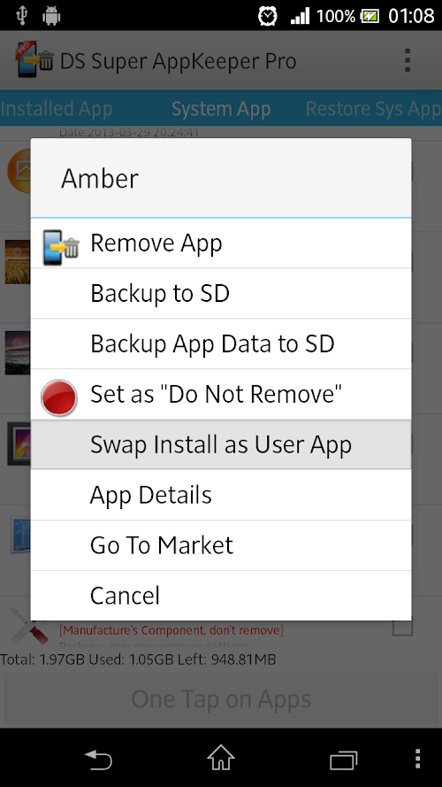 4. Swap install function: It can one-key install user app backup file as system app, or one-key install system app backup (which has no odex file) as user app;