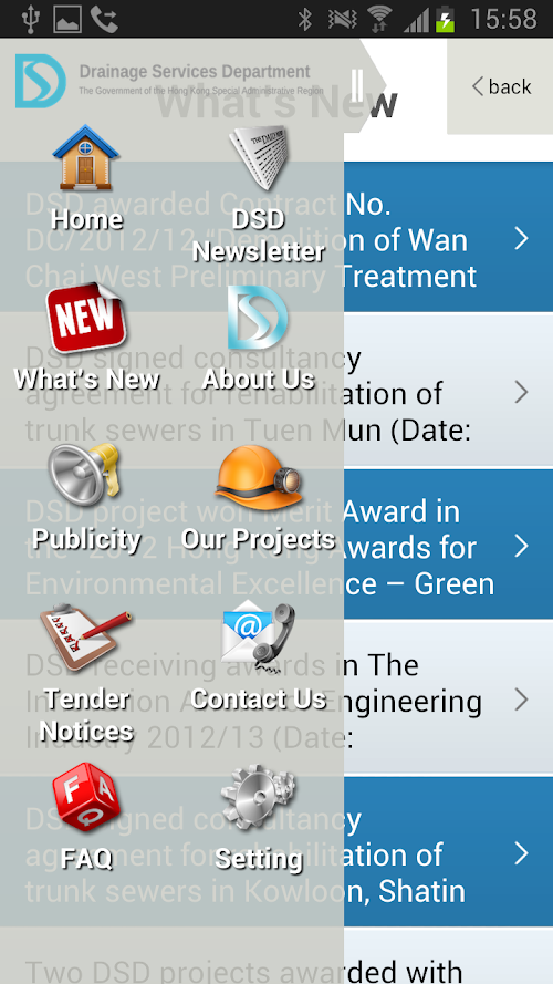 “DSD Connect” provides a fast and convenient way for user to access the information about the Drainage Services Department (DSD) of the Hong Kong Special Administrative Region Government (HKSARG).