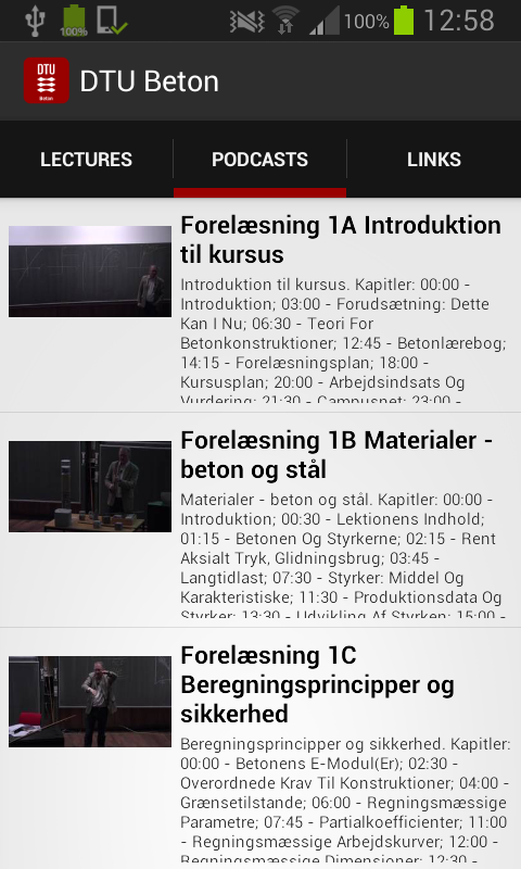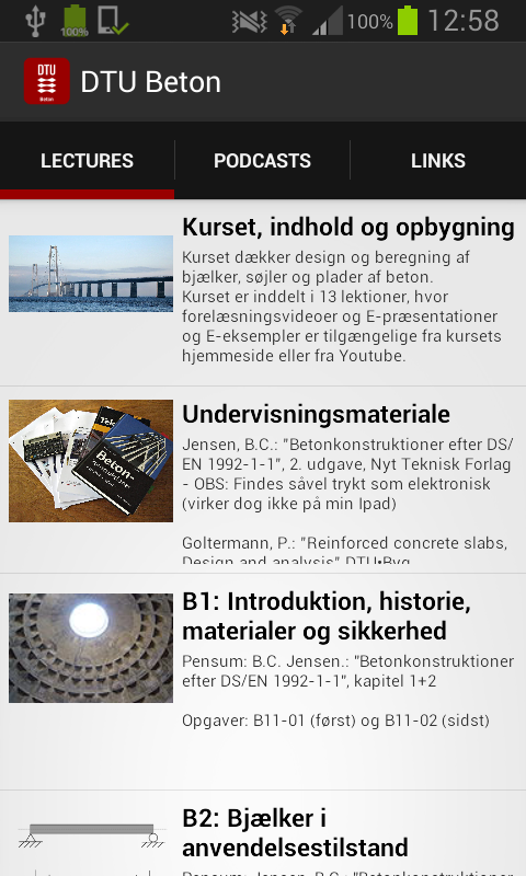 Denne App giver adgang til alt undervisningsmaterialet for de grundlæggende betonkonstruktioner på Danmarks Tekniske Universitet. Du får adgang til kursusoversigt, pensumliste, oversigt over undervisningssessionerne og deres indhold, overheads, E-præsentationer, forelæsningsvideoer, elektroniske eksempler, opgaver og løsninger. Du får på denne måde adgang til det nyeste materiale, som opdateres løbende når nyt kursusmateriale bliver udviklet.