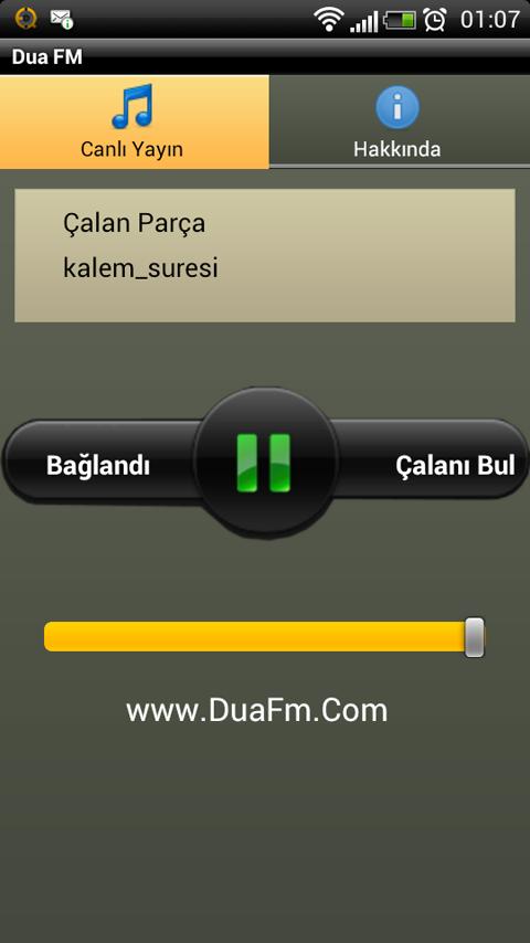 Dua FM İlahi radyosunun android programıdır.Dua FM radyosunu canlı dinlemenizi sağlar.Aynı zamanda çalan ilahinin adınıda göstermektedir.