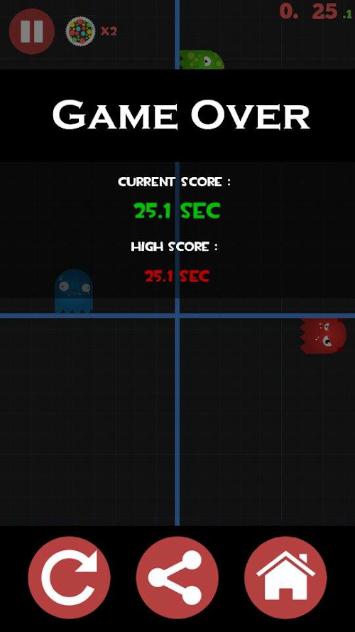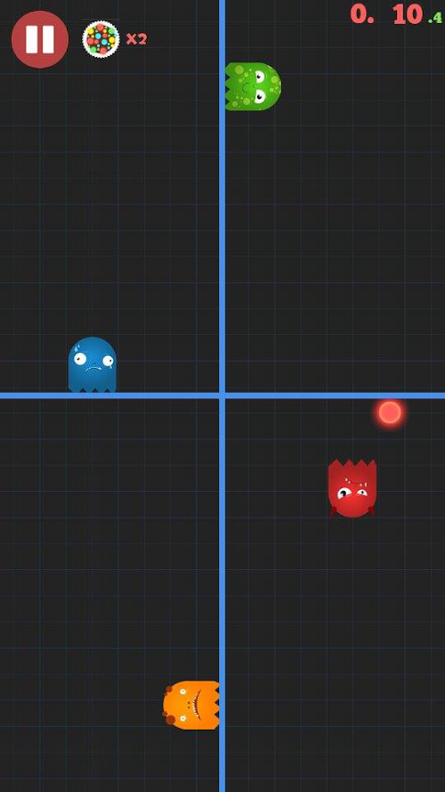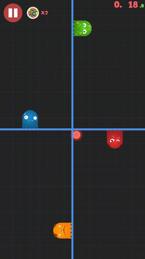 The game begins with four different jelly blob like monsters placed in four different quadrents. At random a ball will appear and try to knock your monster out. Tap in that mosnters box to make the monster jump and avoid the ball. if you are successful you live to jump over the next ball, other wise hit the replay button to try again.