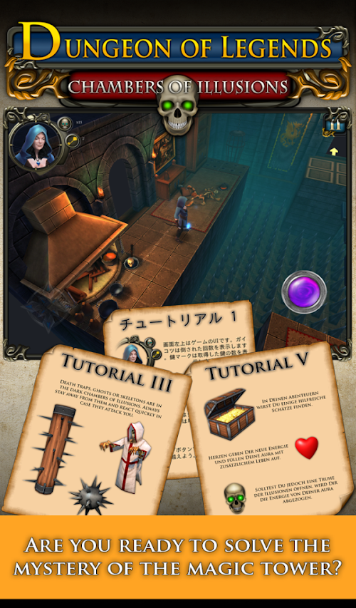 The aim of Dungeon of Legends is to pass through many different rooms. In each individual room awaits many malicious traps and enemies, which you have to dodge. Different keys to open new spaces allow players to discover new mysterious things. In general, the player needs to press a lever, jump from platform to platform, dodge spikes or activate a special mechanism to get a step ahead. The problems to be solved are varied and ensure long-lasting fun. Dungeon of Legends is an action-packed casual game with more than 75 levels. In Dungeon of Legends it depends on the players skill and logic. So Dungeon of Legends combines for the first time the genres jump and run, adventure, puzzle and action and combines it an epic and unprecedented adventure that thrills for many hours. Musical background and detailed 3D graphics underline the standard of the game. The controller varies by platform. On mobile devices are two control units to find, the left one is used to navigate the character and right one as a jump button. In Dungeon of Legends was specially waived complex controls in order not to disturb the flow of the game.